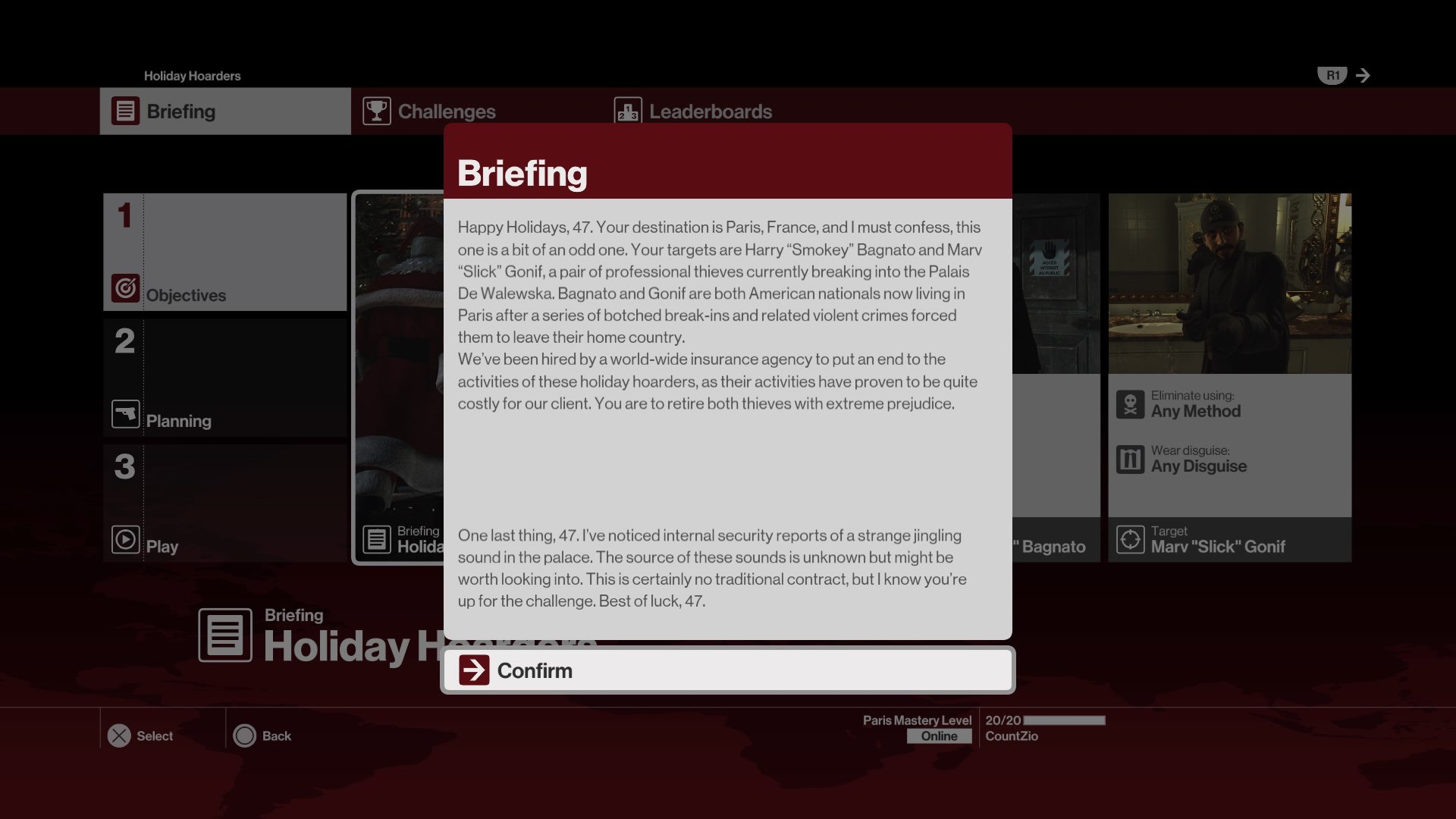 «Твои цели — Гарри Багнато и Марв Гониф, пара профессиональных воров, проникших в Парижский дворец, — говорит координатор Агента 47 Диана Бернвуд. — И Багнато, и Гониф американцы, которые были вынуждены покинуть страну и ныне переселились во Францию из-за серии неудачных краж со взломом и применённого к ним криминального насилия».