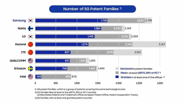 В зачет шли патенты, выданные хотя бы одной патентной организацией — EPO (в Европе), USPTO (в США) или PCT (Договор о патентной кооперации). Как оказалось, южнокорейской компании принадлежит 1728 семейств патентов на 5G, поданы ею заявки на патенты в 2633 семействах, а всего задекларировано 2795 семейств.