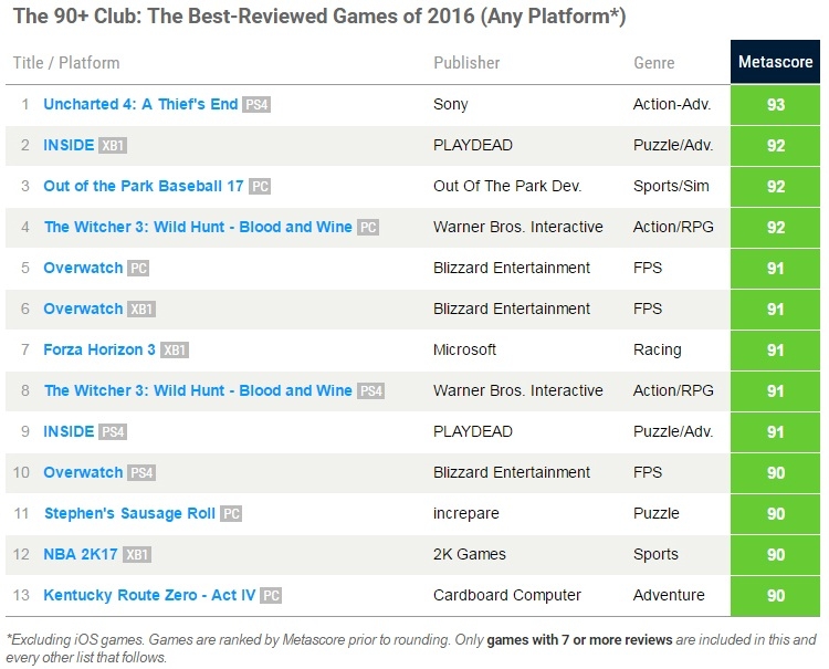 Звание лучшей игры этого года досталось приключенческому экшену Uncharted 4: A Thief’s End — его средний балл составляет 93 из 100 возможных. Всего на один балл отстают платформер Inside, симулятор бейсбольного менеджера Out of the Park Baseball 17 и дополнение The Witcher 3: Wild Hunt — Blood and Wine. Отмечается, что оценки не ниже 90/100 удостоились лишь 9 проектов, три из которых оказались новыми релизами (не сиквелами и не переизданиями). По количеству игр с оценкой 90/100 и выше 2016-й оказался хуже предыдущего года.
