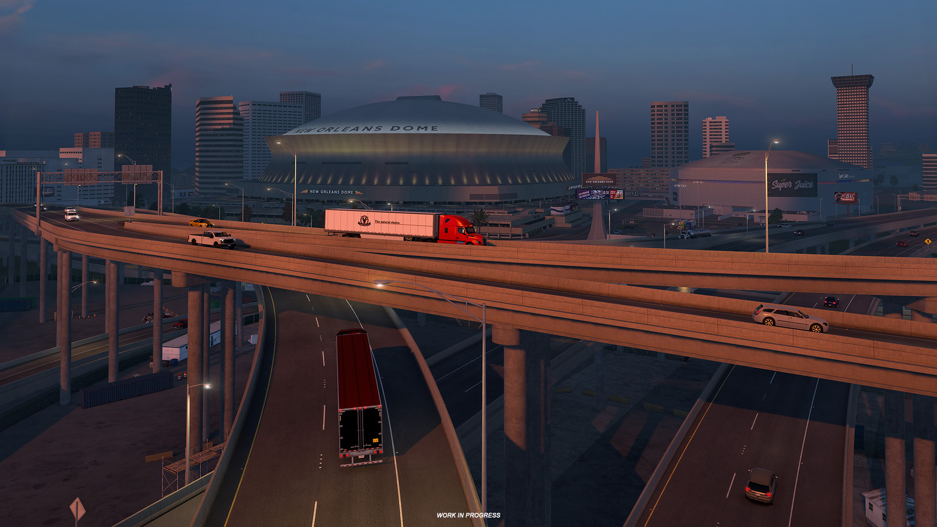 Расположенный на берегах реки Миссисипи, Новый Орлеан является одним из самых узнаваемых городов США. Известный своей музыкой, кухней и неповторимым южным шармом, он живёт и днём, и ночью. В American Truck Simulator игроки получат возможность исследовать некоторые из его самых знаменитых достопримечательностей и дорог.