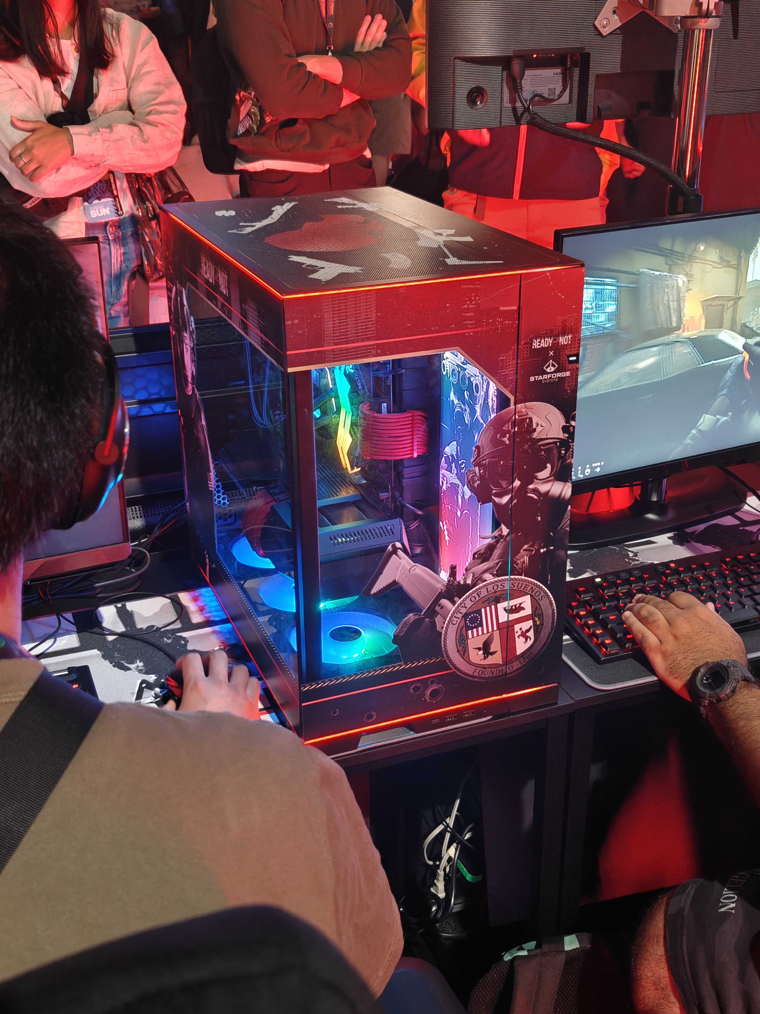 Мы намерены продолжать в том же духе и готовим для вас ещё больше мерча и офлайн-мероприятий. На выставке были показаны несколько новинок, самая заметная из которых — коллаборация с Starforge PCs: эксклюзивный корпус в стиле Ready or Not, который поступит в продажу в следующем году, а также фирменные патчи LSPD и новые коврики для мыши, которые выйдут ещё до конца этого года.