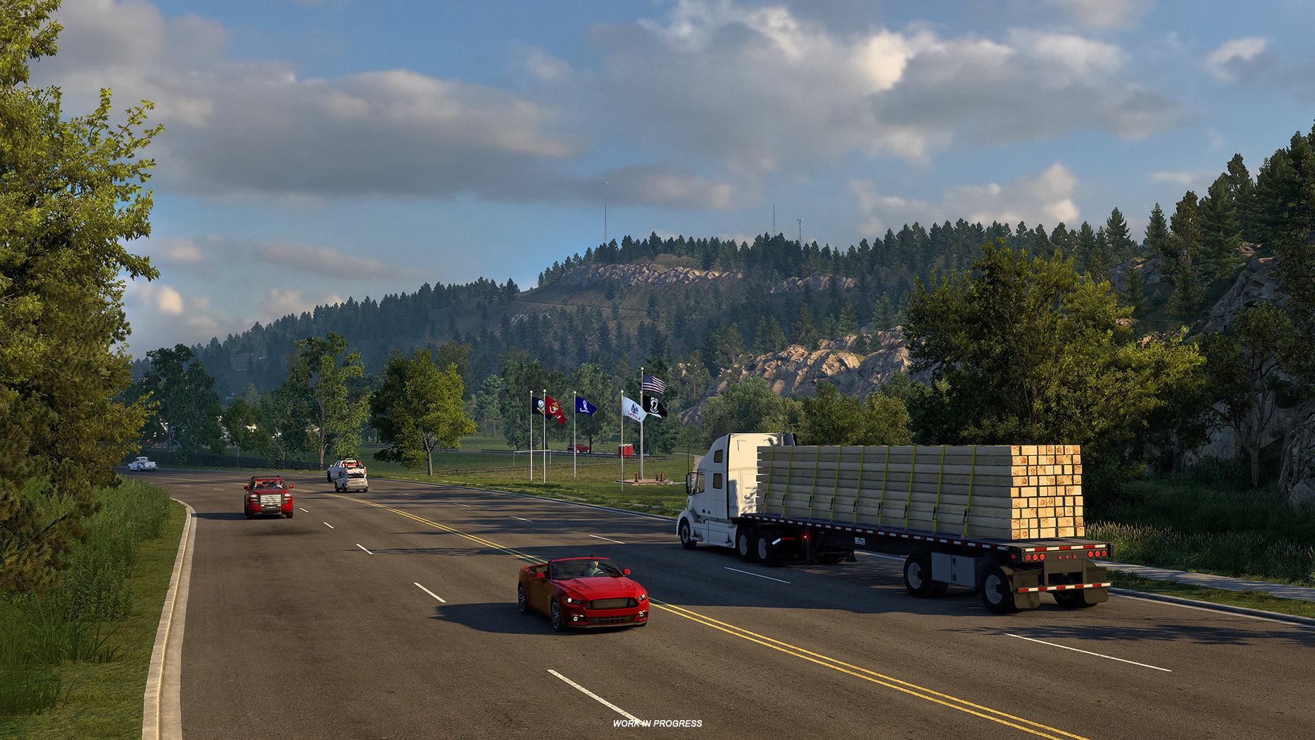 Штат, именуемый «Горный массив Рашмор», расположен в северо-центральном регионе США. Как видно на скриншотах, ландшафт Южной Дакоты предлагает по-настоящему уникальный опыт вождения: от обширных открытых равнин с панорамными видами на окрестности до холмистой местности, густых зелёных лесов, плодородных полей и впечатляющих скальных образований вдоль дорог.