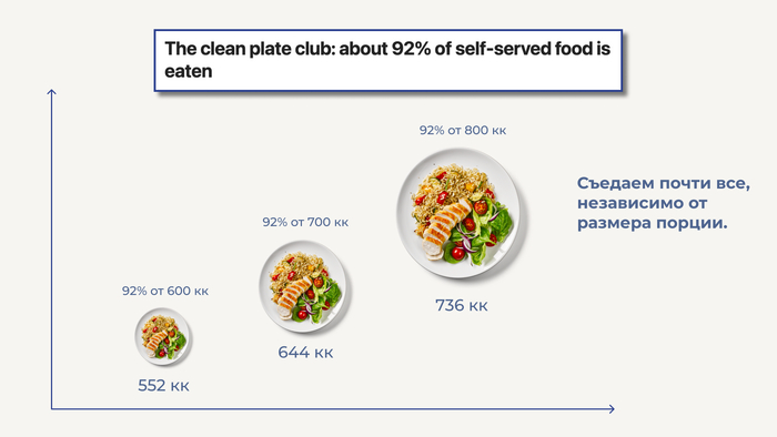 Статистически мы съедаем около 92% того, что положили в тарелку, игнорируя реальные сигналы тела. Чем больше перед нами еды, тем больше ее окажется внутри.