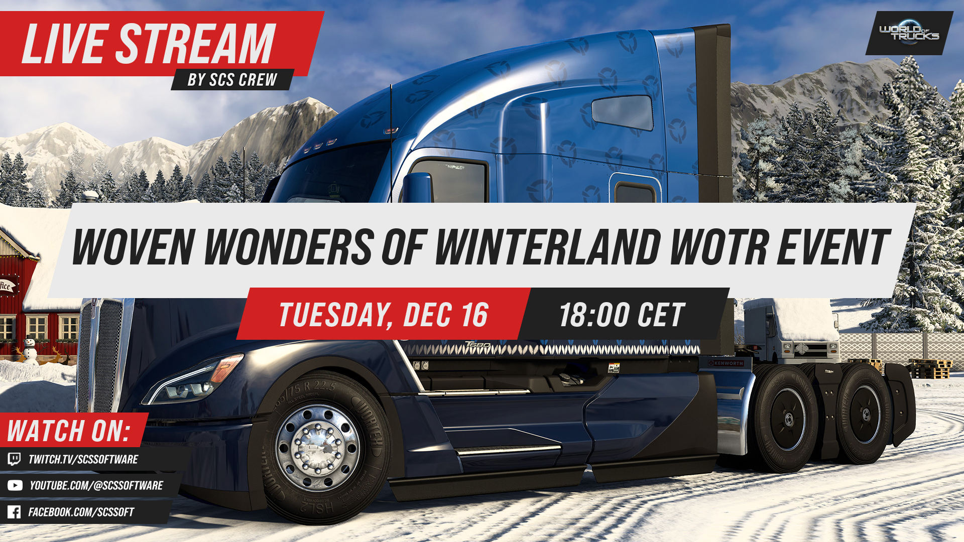 Мы также проведем специальную прямую трансляцию с разработчиками, где мы рассмотрим, как было разработано и создано рождественское событие этого года, в непринужденной беседе с нашими коллегами из команды World of Trucks, а также будем играть и вносить свой вклад в достижение цели сообщества. Присоединяйтесь к нам во вторник, 16 декабря, с 18:00 CET на Twitch, YouTube или Facebook, и исследуйте «Сотканные Чудеса Зимней страны» вместе с нами!