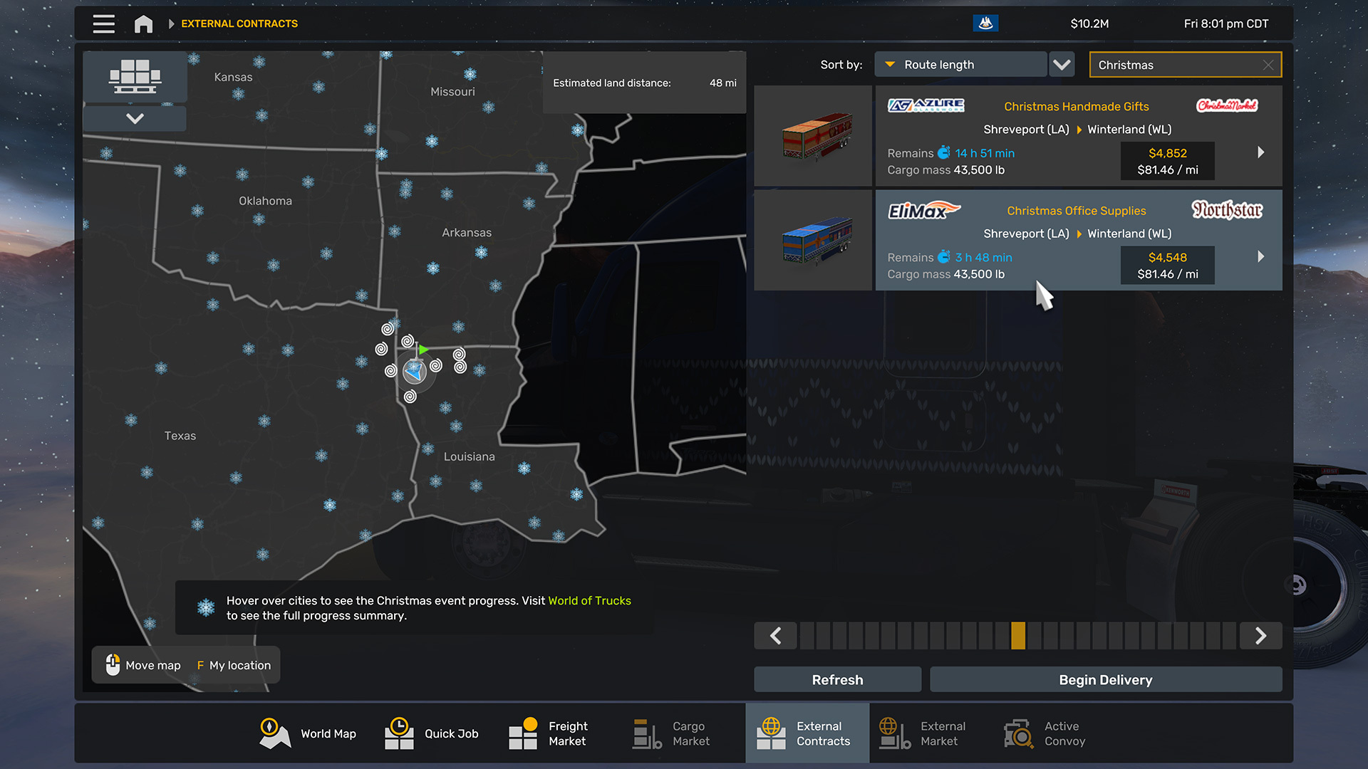 Используя Внешние Контракты с профилем, привязанным к World of Trucks в Euro Truck Simulator 2, American Truck Simulator или обеих играх, сообщество должно доставлять припасы и подарочные наборы в Рождественскую Зимнюю страну и из нее, используя как можно больше городов. В Зимней стране есть 5 различных депо для всех доставок, туда и обратно. Это: