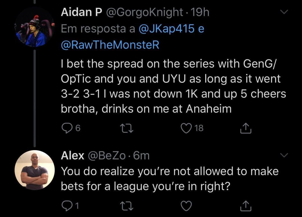 Игрок Midnight Gaming по Call of Duty: Black Ops 4 Айдан «GorgoKnight» Провензано может быть отстранен из-за ставок. Организаторам даже не пришлось вычислять ставочника, он сам похвастался в Твиттере, что поднял денег на матчах лиги.