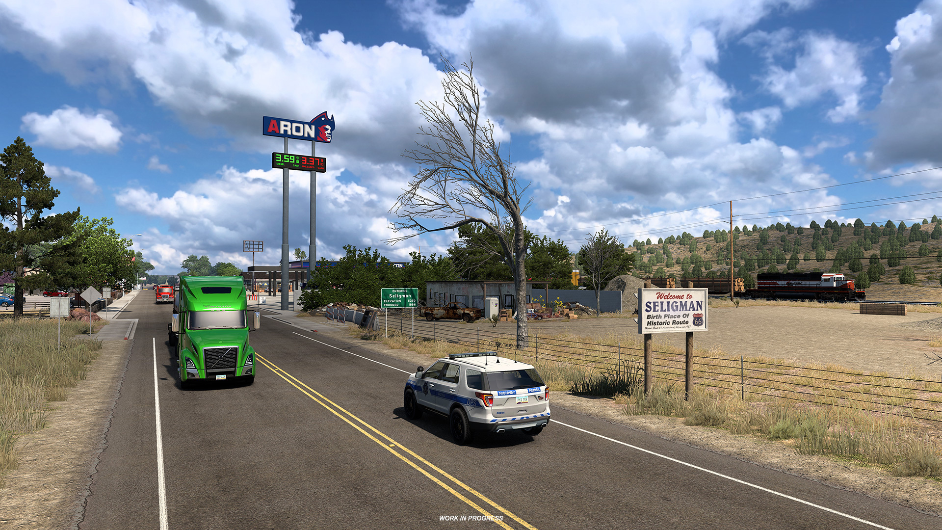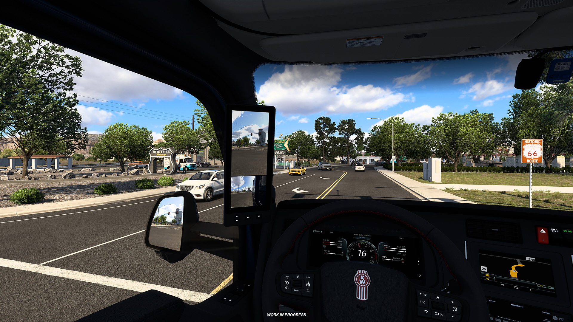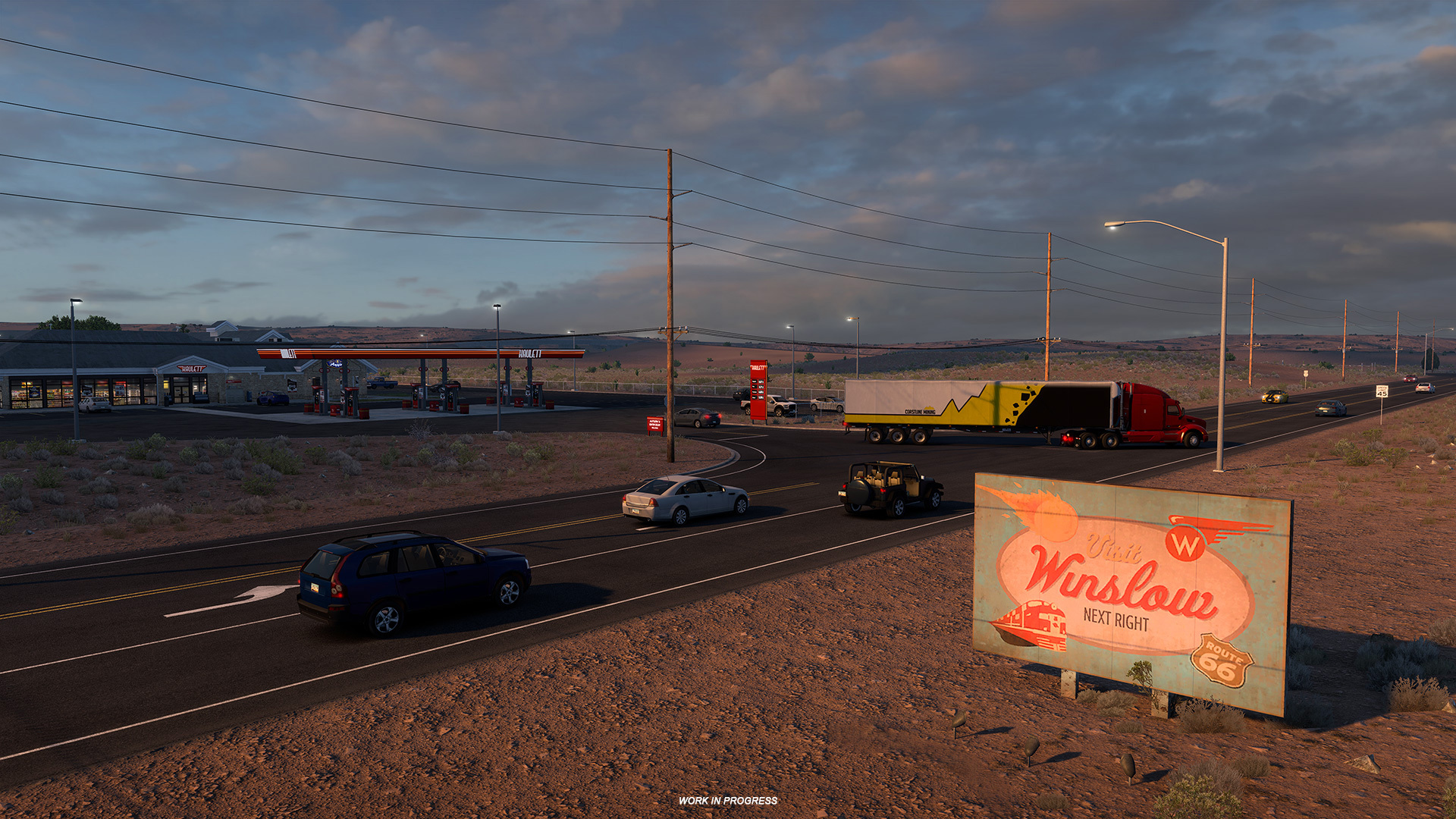 Участок трассы 66 через Аризону стал особенно захватывающим испытанием: такие знаковые остановки, как Кингман, Флагстафф и недавно добавленный Уинслоу, получили значительное внимание. Мы тщательно изучили, как эти города расположены вдоль шоссе в реальности, как изгибаются дороги, где сосредоточены предприятия, как ландшафт формирует маршрут, и откорректировали их игровые макеты, чтобы лучше передать реальный опыт.