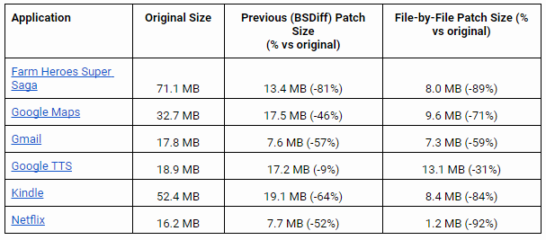 Но основной эффект достигается благодаря новой системе под названием file-by-file patching («пофайловое исправление»): она обеспечивает обновления, на 65 % меньшие по размеру, чем само приложение, причём в некоторых случаях эта цифра может равняться и 90 %. Размер обновления Netflix, например, теперь составляет не 16,2 Мбайт, а всего лишь 1,2 Мбайт. Для сравнения, вышеупомянутый метод bsdiff уменьшал размер обновления приложения лишь до 7,7 Мбайт.