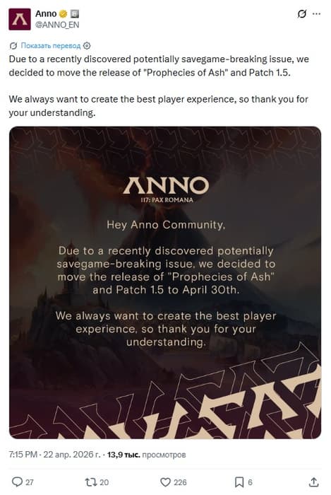 Компания Ubisoft официально объявила о смещении графика релиза обновления 1.5 и расширения «Пророчества пепла» (Prophecies of Ash) для градостроительной стратегии Anno 117: Pax Romana.