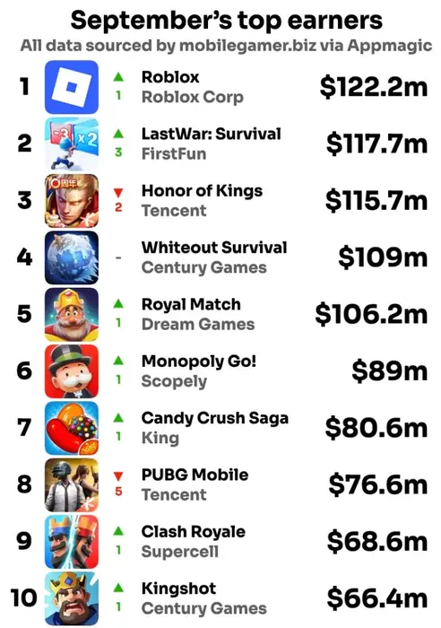 Roblox вернулась на первое место рейтинга, несмотря на продолжающееся сокращение выручки. В сентябре проект принес $122 млн — на $35 млн меньше, чем в августе. Тем не менее на фоне общего снижения доходов этого оказалось достаточно, чтобы снова опередить конкурентов.