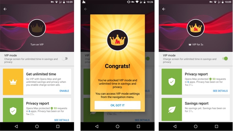 С новым VIP-режимом временные ограничения будут сняты, а в обмен во время зарядки на экране мобильного устройства будет отображаться реклама. Включив VIP-режим, можно получить неограниченный доступ ко всем функциям Opera Max, даже когда аппарат не нуждается в зарядке.