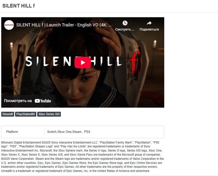 Похоже, Konami намерена расширить перечень платформ, на которых будет доступна Silent Hill f. Игра уже вышла на PS5, Xbox Series X|S и ПК, но недавние изменения на официальном сайте издателя указывают на возможный релиз и для консолей предыдущего поколения.