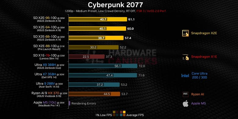 В требовательной Cyberpunk 2077 обновленное видеоядро Qualcomm хоть и уступает лидеру в лице Arc B390, разрыв не выглядит критическим. При этом платформе удается опередить Radeon 890M.