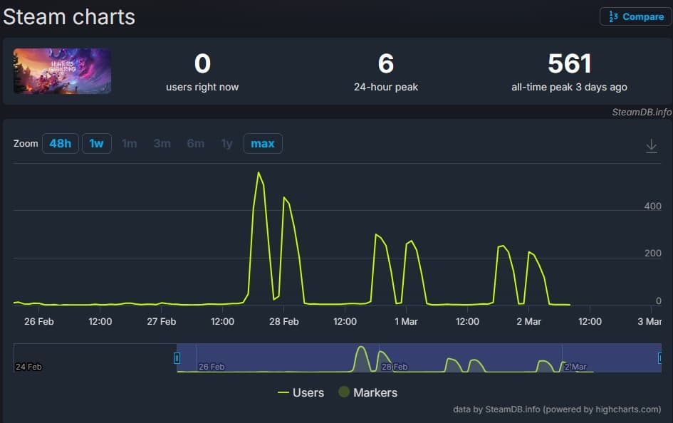 Попасть в число тестировщиков было достаточно просто, однако статистические данные Steam вызывают серьезные опасения. Пиковое количество одновременных пользователей на ПК едва достигло 561 человека, а к вечеру воскресенья этот показатель и вовсе сократился до 226 активных участников.