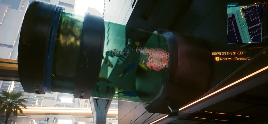 В центре внимания оказался объект над шоссе — огромный аквариум с рыбами. Игру так захватил момент, что ролик внезапно обрывается сцены с машиной, врезающейся в персонажа.