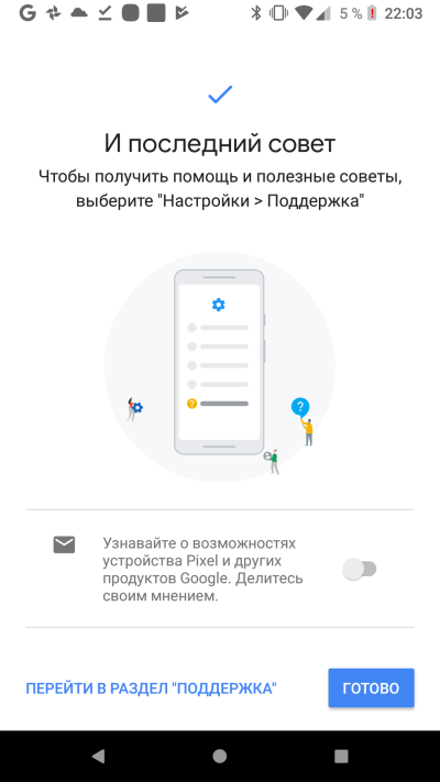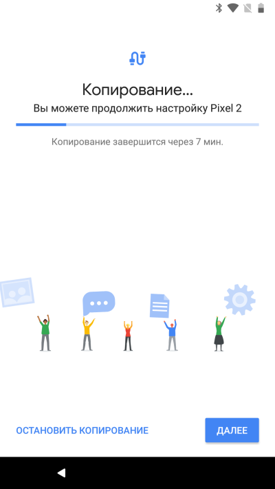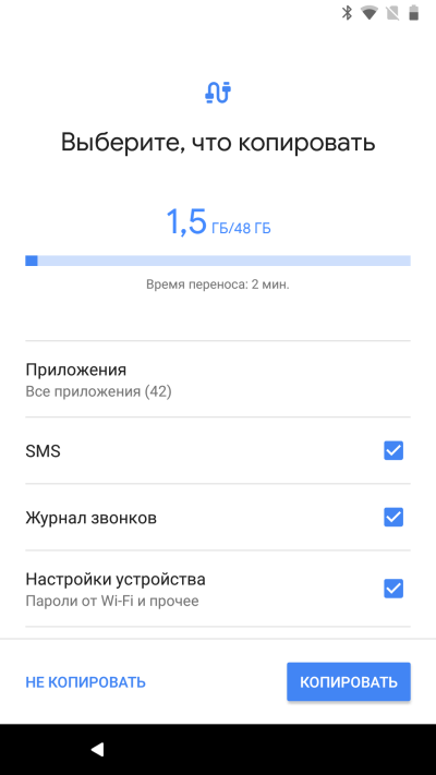 Приятный момент нового Pixel 2 – простота настройки. Для этого применяется обычный перенос установленного софта и учетных записей с другого Android-смартфона, но их даже не обязательно пытаться «подружить» по воздуху – в комплекте имеется двусторонний USB Type-C кабель. Я таким образом перенес с предыдущего смартфона (OnePlus 5T, о котором чуть позже) не только почти полный образ системы, но и часть контента.