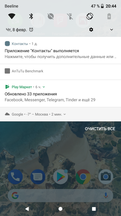 Про операционную систему лишний раз сказать нечего – на момент написания обзора это Android 8.1 Oreo, самые быстрые обновления гарантированы. На этот раз обошлось без какой-либо оболочки, специфического Pixel Launcher – все опробованные в прошлом году черты перешли на «общий» Oreo. Главная радость Pixel 2 – минимум предустановленного софта, Google ничего не навязывает, кроме своих собственных сервисов, предусмотренных по умолчанию (почти) на любом Android-смартфоне. Работает система очень быстро, ни малейших намеков на какие-то баги или утечки памяти я не заметил. В режиме ожидания энергопотребление минимальное.