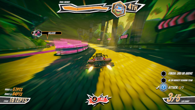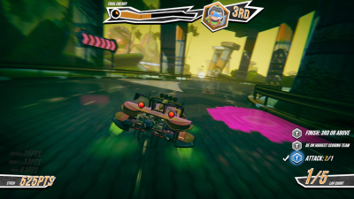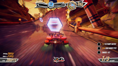 В другом режиме нельзя вручную раскрашивать трассу, зато ворота расставлены буквально на каждом шагу и исчезают после первого их использования. Ускорение работает по тому же принципу, что и в других режимах, поэтому наиболее расторопная команда постарается как можно скорее активировать все ворота и окрасит трек в свои цвета. Всего в Trailblazers десять уникальных трасс, у каждой из которых есть по несколько вариаций, так что с разнообразием тут проблем нет. На некоторых трассах случаются небольшие провалы производительности, но они не сильно мешают и к столкновениям почти никогда не приводят.