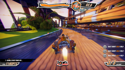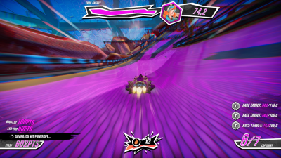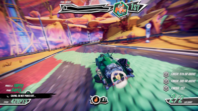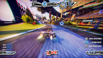 Поэтому и управление в игре максимально простое. Есть газ, тормоз и кнопка для расплескивания краски. Если нажать на «треугольник» на геймпаде PS4 (или на соответствующую кнопку на клавиатуре), краска выплеснется из вашего болида по прямой и собьет с пути оппонентов, едущих впереди. Больше ничего нажимать не приходится, если не считать поворотов с помощью стика.