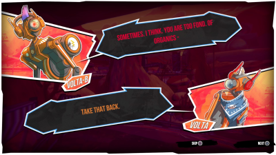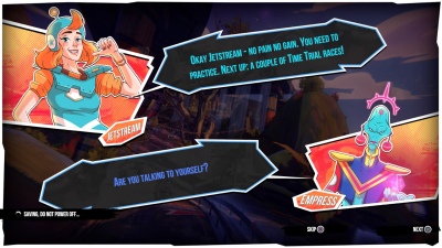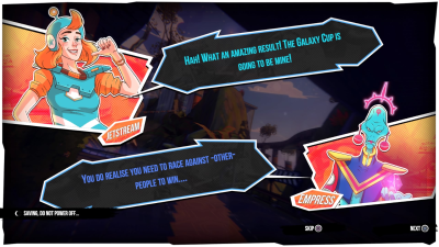 Но Trailblazers — не только мультиплеерная игра. Еще она предлагает полноценную сюжетную кампанию, состоящую из нескольких десятков глав. Называть ее обучающим режимом, который готовит пользователя к гонкам в онлайне, было бы неправильно, так как каждый новый заезд сопровождается неплохо написанными диалогами. В игре нет захватывающей истории, но переговоры героев друг с другом не наскучивают, да и время от времени можно посмеяться над удачными шутками. Единственное, что слегка раздражает, — это смешки персонажей в начале каждой новой фразы. Прием используется в визуальных новеллах, но там обычно все звучит не так вымученно и натянуто.
