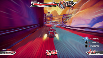 Каждая сюжетная глава предлагает три испытания и, насколько я понял, для прохождения уровня достаточно выполнить хотя бы одно из них. Какие-то задачи очень простые (проехать сквозь 15 колец, выстрелить краской в одного противника), другие могут вынудить перезапускать гонку раз за разом — через пару часов, к примеру, открывается миссия, где нужно занимать лидирующую позицию на каждом из четырех кругов во время одного заезда. Для доступа к следующему заданию можно было приехать первым лишь на одном круге, но просто так сдаваться мне не хотелось. Хотя медальки, которые выдают за испытания, нельзя использовать ни для чего полезного, получать их все равно приятно.