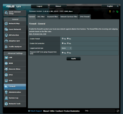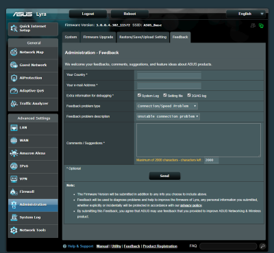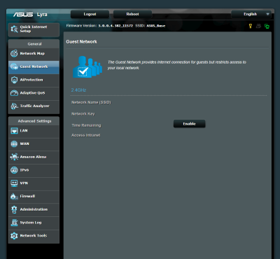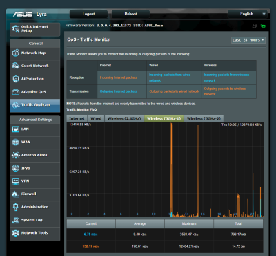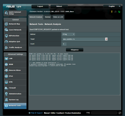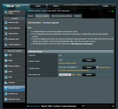 Прошивка здесь по большому счёту та же самая, что в других моделях ASUS, но часть функций и настроек отсутствует, а часть скрыта. Например, некоторые параметры Wi-Fi можно изменить, только прямо перейдя на http://router.asus.com/Advanced_Wireless_Content.asp, что разумно, так как неопытный пользователь может нарушить работу сети. Для тестов в этом разделе были принудительно выбраны наиболее скоростные режимы работы точек доступа. А вообще ASUS старается постепенно перенести всё управление параметрами в мобильное приложение. Часть функций — например, AiProtection (модуль Trend Micro Smart Home, см. обзор RT-AC87U) или отключение подсветки — доступна только в нём. И после настройки главного модуля Lyra оно нормально работает, в том числе удалённо, через Интернет.