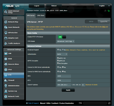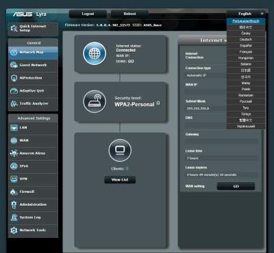 А вот с чем есть проблемы, так это с настройкой главного модуля. Изначально у него есть открытая точка доступа, к которой можно подключиться и настроить параметры сети с помощью встроенных средств Windows. Это не сработало. Можно попытаться открыть веб-интерфейс (http://router.asus.com/), в котором тут же запустится мастер настройки. И это тоже не сработало, так как параметры попросту не сохраняются. Третий вариант — воспользоваться приложением Lyra для Android или iOS. Но Android-программа каждый раз закрывается с ошибкой на этапе подключения к Lyra по Bluetooth. Единственный рабочий вариант такой: подключиться к открытой точке доступа, открыть страницу http://router.asus.com/Main_Login.asp, сменить пароль и повторно войти.