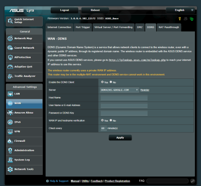 | Сервисы Dynamic DNS | ASUS, Google Domains, DNS-O-Matic, DynDns, NO-IP, ORAY, Selfhost, Tunnelbroker, ZoneEdit |