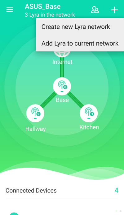 Что изменилось? Чипсеты новой волны стали поддерживать сразу три диапазона Wi-Fi: один в 2,4 ГГц и два в 5 ГГц. Ну и быстрее они стали, конечно. Вот и появилась здравая идея использовать наименее загруженный из этих диапазонов для создания опорной сети, которая соединяет несколько точек доступа. Ну а они, в свою очередь, уже отдают сигнал клиентским устройствам. ASUS Lyra, как и похожие продукты других производителей, использует именно такую схему работы. Одно из устройства Lyra назначено главным — оно подключается к Интернету. А все остальные Lyra подключаются либо к главной точке, либо по цепочке друг к другу. Причём заранее предсказать, как именно будет устроена цепочка, трудно. Во время теста перемещение одной точки доступа всего на метр привело к изменению конфигурации опорной сети.