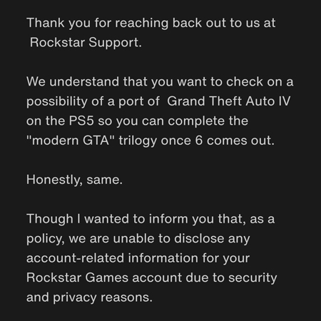Во-вторых, игрок задал вопрос о выпуске Grand Theft Auto IV на PS5, на который оператор не дал однозначного ответа, но выразил надежду на возможное появление этой версии.