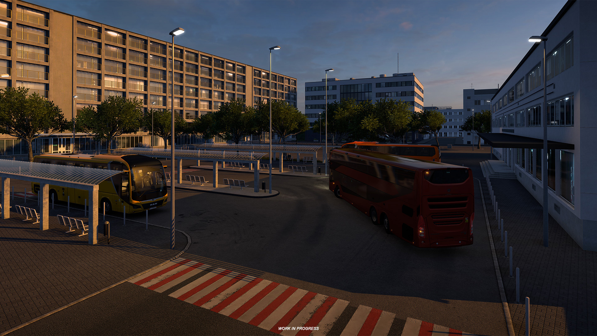 На старте проекта «Coaches» на карте ETS2 уже присутствовало немало заготовок автобусных станций. Многие из вас наверняка замечали их задолго до нашего официального анонса. Но если раньше они служили лишь декорациями, то теперь нам пришлось пересмотреть их функционал. Значительная часть разработки была посвящена переработке этих объектов: мы обновили их планировку, а во многих случаях воссоздали с нуля, чтобы они точнее соответствовали реальным прототипам и гармонично вписывались в окружающую среду.