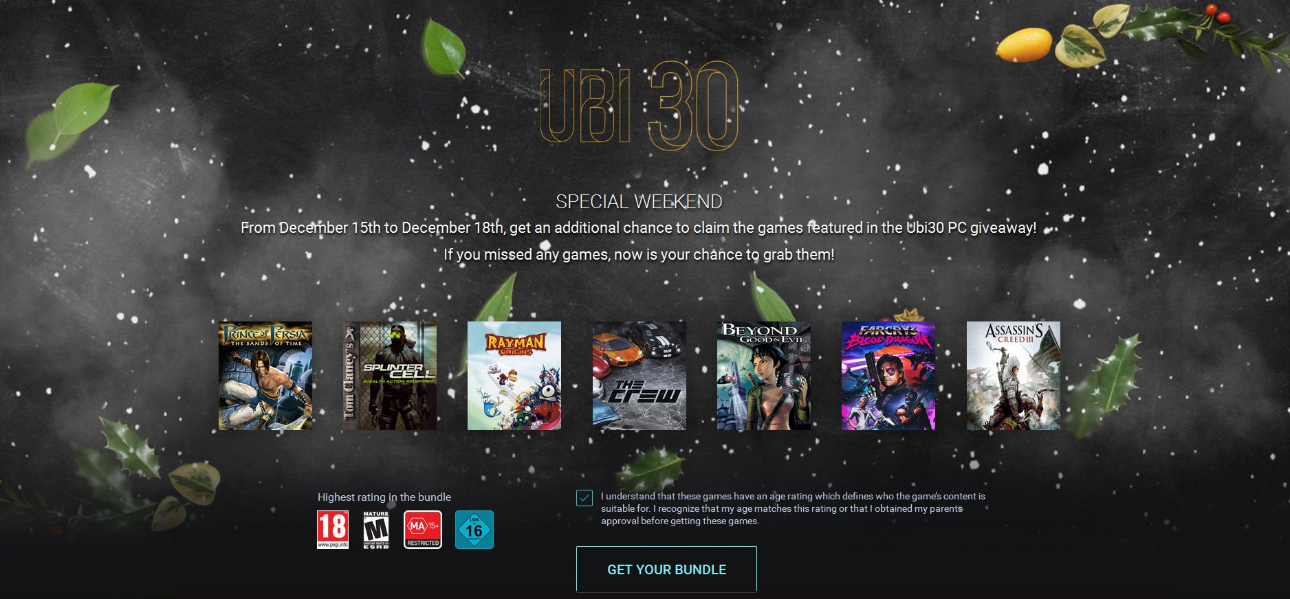 Если вы вдруг по какой-то причине не обзавелись одной или несколькими играми, которые компания Ubisoft бесплатно раздавала в рамках празднования своего тридцатилетия, не отчаивайтесь — с 15 по 18 декабря вам предоставляется второй шанс заполучить упущенные подарки.