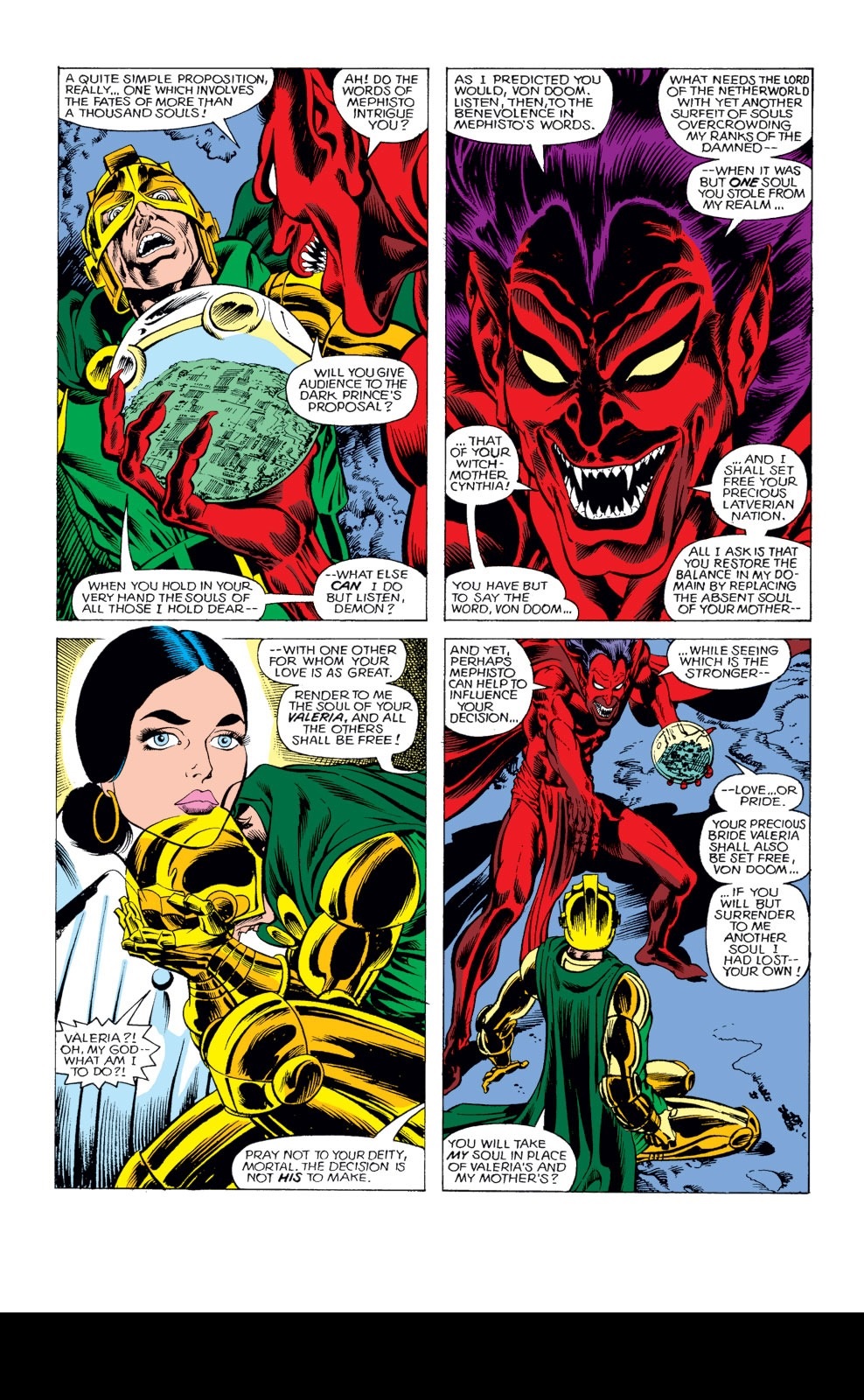 И все бы ничего, но Мефисто остался недоволен, что из его владений выкрали душу. Он вступил в схватку с Думом и победил его, поставив условие — либо народ Латверии падет, либо Дум отдаст свою душу, ну или душу того, кого любит больше всего.