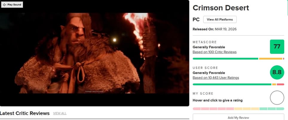 Проделанная работа получила положительный отклик у сообщества, что наглядно подтверждает пользовательский рейтинг на Metacritic. На текущий момент Crimson Desert удерживает звание второй самой востребованной новинки 2026 года по мнению игроков. С результатом 8,8 балла из 10 проект обошел Pokemon Pokopia (8,5/10), уступая пальму первенства лишь Resident Evil Requiem (9,4/10).