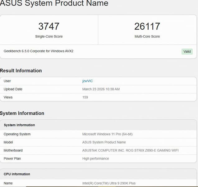 В базе данных бенчмарка Geekbench 6.5, на которую обратил внимание инсайдер под ником HXL, 24-ядерный Core Ultra 9 290K Plus продемонстрировал внушительную производительность. При тактовой частоте 5,8 ГГц процессор набрал 3747 баллов в однопоточном режиме и 26 117 баллов в многопоточном тесте.