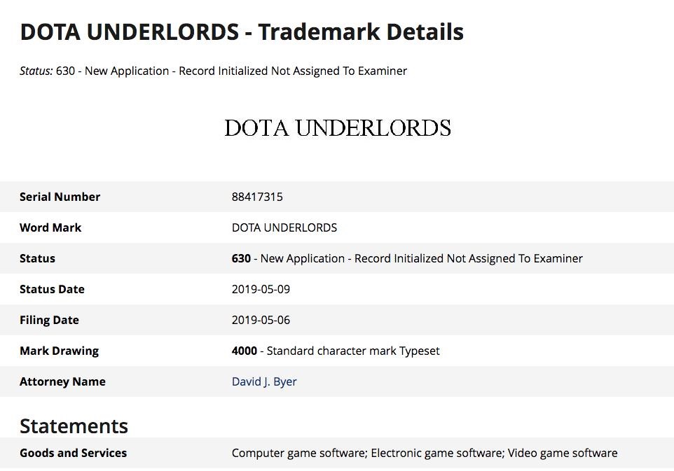 15 мая Valve зарегистрировала торговую марку Dota Underlords. В описании указано, что это игровое программное обеспечение (video game software).