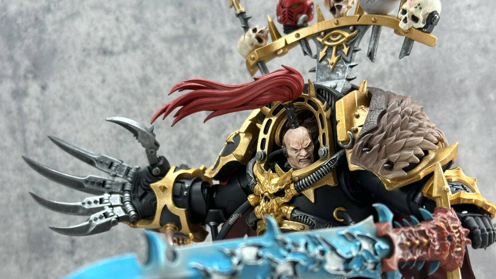 Облик воителя Хаоса дополнен массивным терминаторским доспехом паттерна «Катафракт». В комплект входят сменные кисти, боевая маска, трофейные наплечные элементы, а также легендарное вооружение: Драк’ниен — колдовской клинок с заточенной в нем демонической сущностью, и «Коготь Хоруса» — разрушительная перчатка с интегрированным комби-болтером.