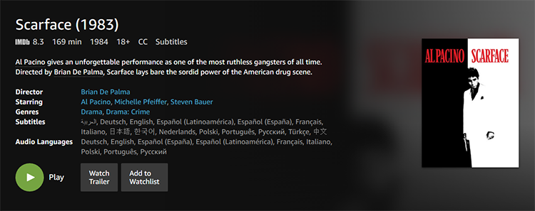 Что касается поддержки русского языка, то на данный момент в Prime Video присутствует всего три страницы с фильмами и сериалами, оснащёнными русскими субтитрами. При этом кое-какой контент доступен и с русским дубляжом — например, «Скотт Пилигрим против всех» и «Лицо со шрамом».