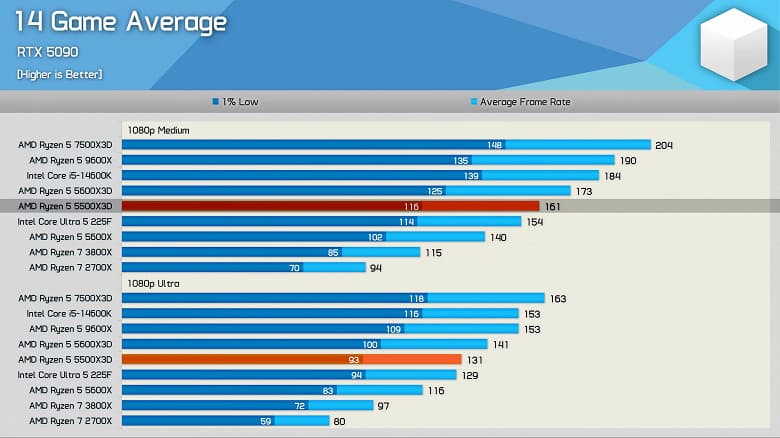 В игровых тестах Ryzen 5 5500X3D закономерно уступает модели 5600X3D, но при этом уверенно обходит стандартный Ryzen 5 5600X, демонстрируя паритет с новым Core Ultra 5 225F.