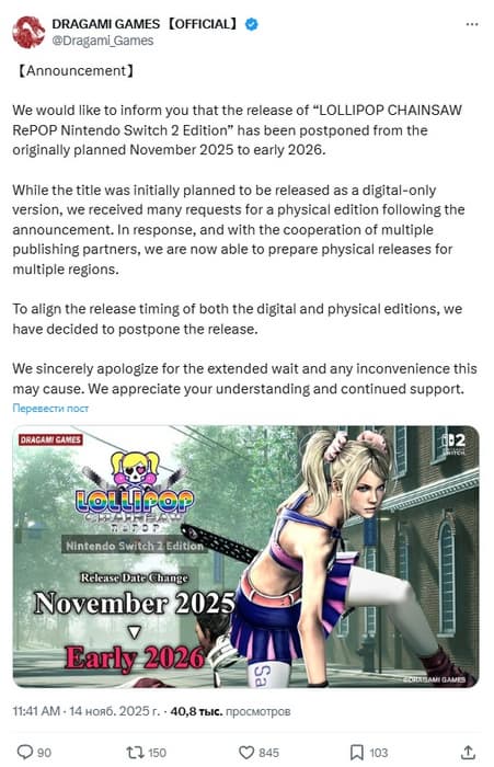 Разработчик и издатель подтвердили работу над физическим изданием. Dragami Games намерена выпустить коробочную и цифровую версии одновременно — ради этого релиз Lollipop Chainsaw RePOP на Switch 2 и отложили, чтобы успеть реализовать задуманный план.