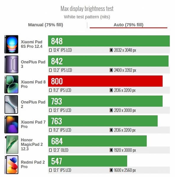 Несмотря на привычные характеристики «на бумаге», на практике гаджет Xiaomi показал блестящий результат: 13 часов 39 минут активной работы. Это существенно выше показателей большинства аналогичных устройств и даже превосходит автономность iPad Pro 11.
