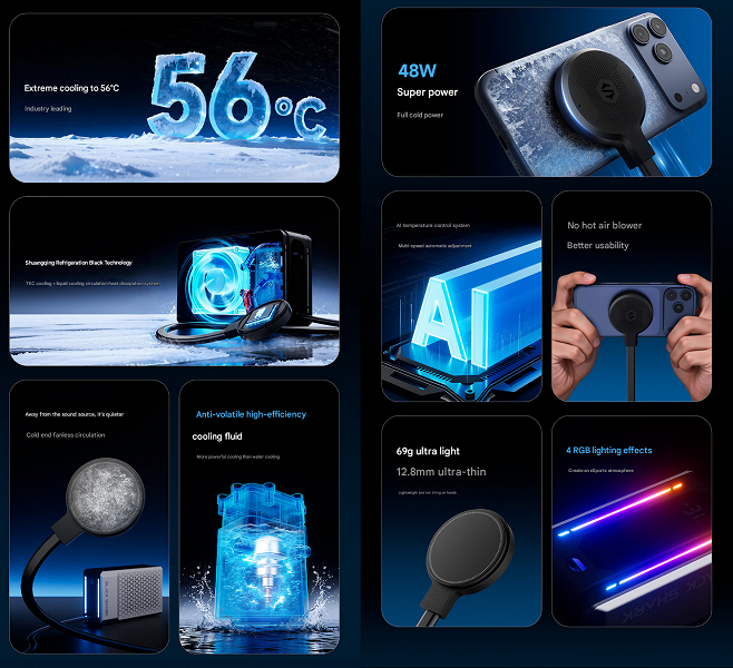 Устройство получилось на удивление компактным: его вес составляет всего 69 граммов, а толщина корпуса — 12,8 мм. Дополнительно Black Shark 6 Ultra оснащен эффектной RGB-подсветкой, встроенным светодиодным дисплеем для мониторинга текущей температуры и отличается премиальным футуристичным дизайном.
