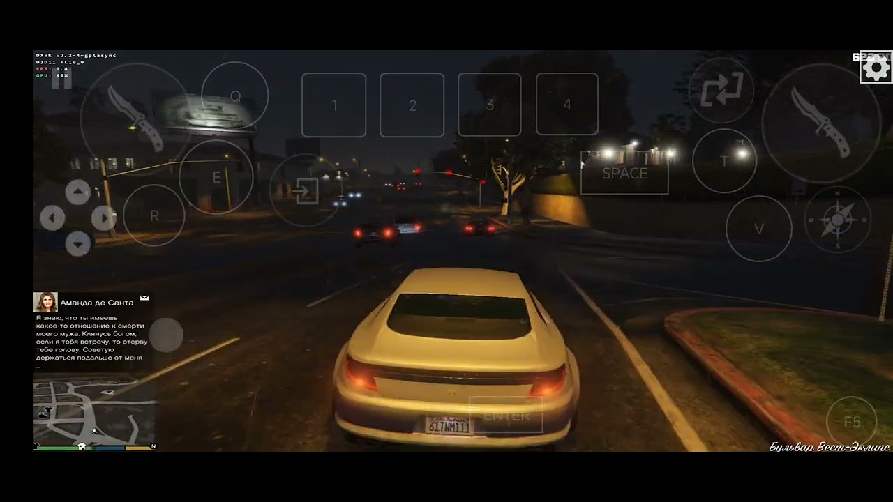 Grand Theft Auto 5 на смартфоне выдавала 8-15 FPS во время поездки по ночному городу, шёл дождь.